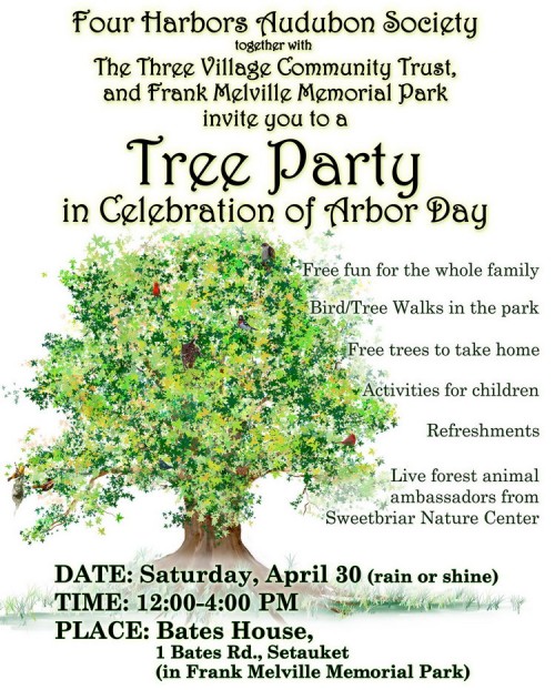 Tree party! No, this is not an Entmoot. (Anyone get that?) It’s an Arbor Day celebration for the whole family. Four Harbor’s Audubon Society, of which I am a proud member, along with the Three Village Community Trust and Frank Melville Memorial Park will be hosting a Tree Party at the Bates House at the park Saturday, April 30th. It looks to be a pretty cool event. There will be activities for the younger ones as well guided tours through the park for everyone. This is an excellent park with varied habitats including two ponds, a saltwater marsh, wooded ares, and open fields. There will be plenty of info about the trees and the animals that depend on them. Think birds, but it doesn’t stop there. Sweetbriar Nature Center will have a presentation of several animals. If you’ve never seen a Sweetbriar presentation, you’re missing out. It’s a wonderful chance to see the critters that live in our own back yards but that we very rarely get to see, and certainly not up close. Also, lest I forget, there will be free trees for all to take home. These trees were especially chosen to grow well here on Long Island. Come get yours. JK.