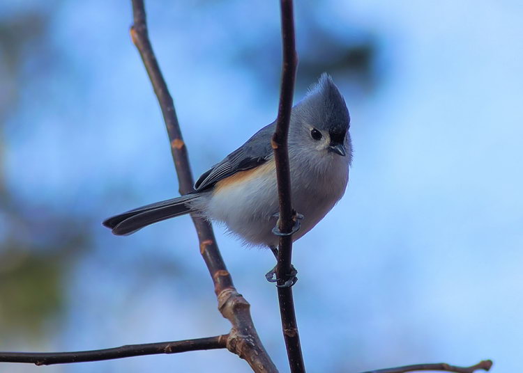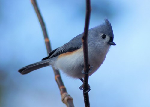 Here are a couple of shots of another Tufted Titmouse I encountered at Morton Refuge. These guys are generally gray or slate-colored but in this light, this one almost appears to be blue. These are very engaging little birds, only marginally larger than Chickadees, but a bit shyer. Still, once they give you a good once-over, (sometimes it’s a twice-over), they are one of the species of birds that will accept sunflower seeds from your hand at Morton. That such fragile beings could come to trust creatures such as us is, to me, nothing less than amazing. JK