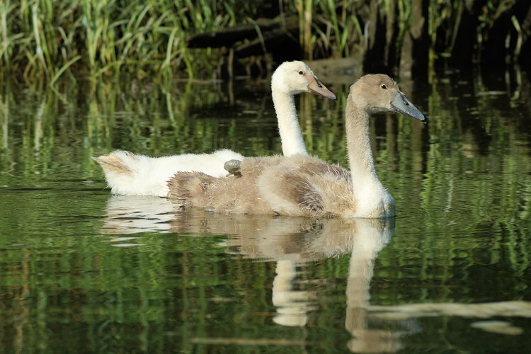 Here are a couple of Mute Swan cygnets. Ugly ducklings, if you will. This shot shows the two color morphs of these swans. Even their bills differ. Despite these very apparent differences both of these birds will eventually attain the all-white plumage of their parents. JK