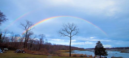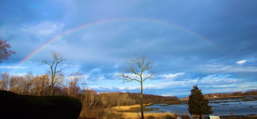 I was looking out my window when I first spied this rainbow. It appeared out of nowhere and didn’t last more than twenty minutes. Last night was fairly stormy, with lots of rain and wind, but by this morning it was only spritzing here and there occasionally. I went outside to capture these images – sometimes shooting through a window just doesn’t cut it. If you want to take photographs of the ‘Great Outdoors’, you really need to be outdoors. Unfortunately, the ‘Great Outdoors’ began to rain on me fairly steadily by the time I was taking the third shot. Luckily, I had grabbed enough captures to show you folks the prize that Mother Nature saved for me today. After a long night, these views were a very welcome respite. A bit of chicken soup for the photographer’s soul, as it were. JK
