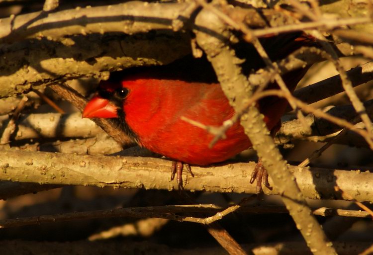 This Northern Cardinal is peering at me through a maze of branches. JK