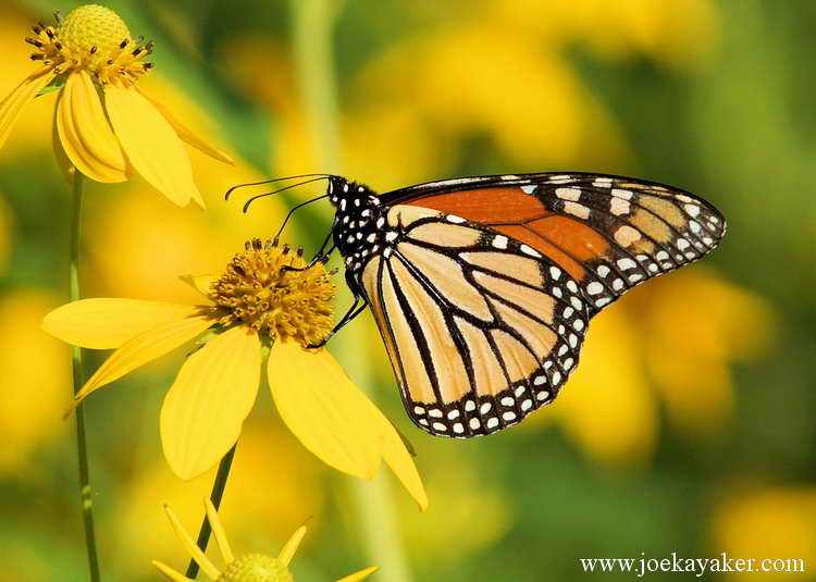 Another Monarch Butterfly on another flower. And yet another time that Sue Avery has come through and identified the flower here. Trust me, without Sue’s help this is just an orange bug on a yellow flower. Check out her blog, The Tangled Wood. She writes very well, without any of that wiseguy stuff you find at other blogs, namely this one. JK.