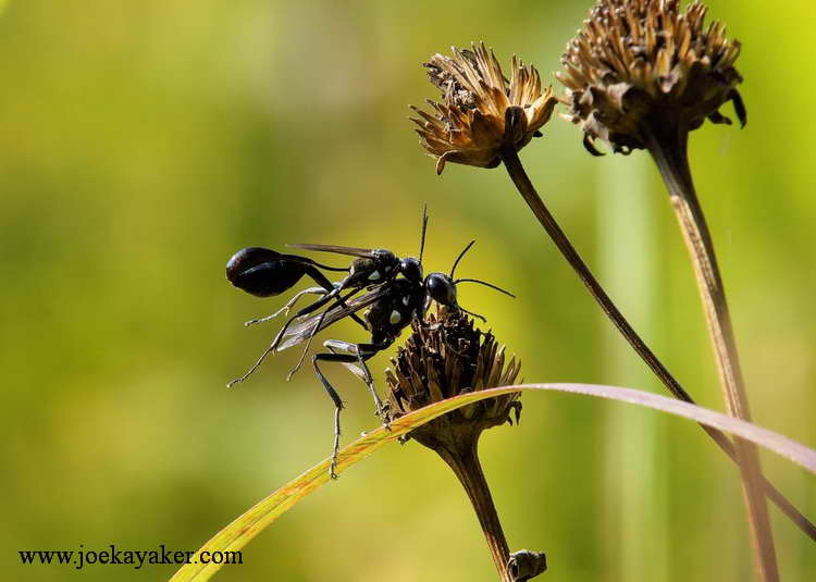 Notice how the wasps are on the dried out brown flowers and you have the bee on the bright white blossom — it looks like you’re casting a movie for a showdown between cowbee pollinators. 🙂
