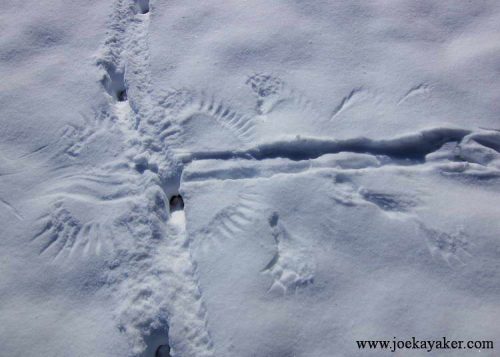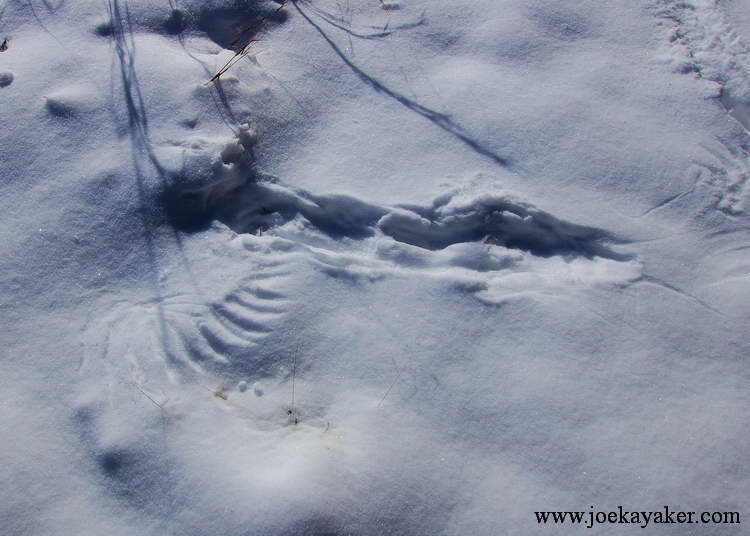 I was hiking through the Elizabeth A. Morton Refuge the day after a snow storm recently. In many places, my own boot prints were the first tracks in the snow, but not everywhere. I may have been the first human to have visited the refuge since the storm but there were plenty of critters who had left their mark before I got there. From squirrels to deer prints and the tracks of turkeys and countless smaller birds, there were many signs of non-human visitations. I love seeing all those fresh tracks in the snow but these snow angels à la Wild Turkeys were perhaps the coolest animal tracks I saw all day. In the above photo, you can see the tracks of a deer that walked over the “angel”. The photo below shows a snow angel that was directly to the left of the photo above. I was unable to discern whether one turkey made both snow angels or if there were two turkeys working in tandem. Either way, it sure was a great find. JK.