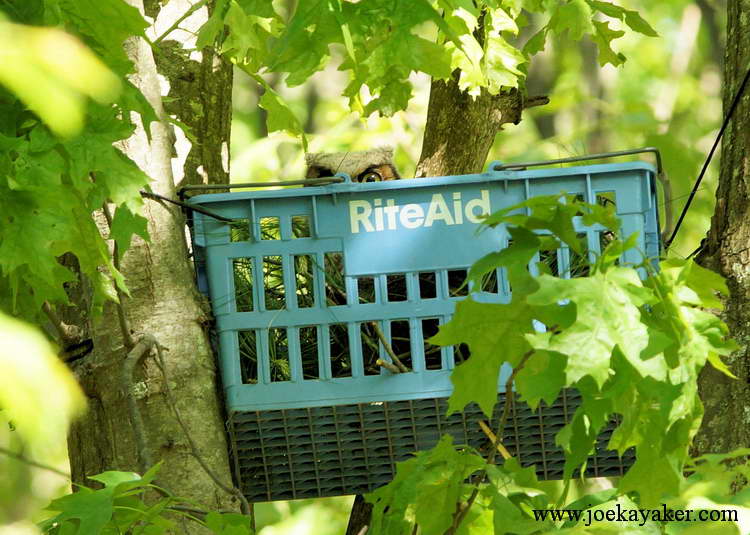 John Scarola and I transported the owl back to where the owl had been found. The two homeowners who had called the Smithtown Animal Shelter were able to show us the exact spot. We selected a nearby tree and John secured a new “nest” about twenty feet up. This new nest is actually a re-purposed drugstore shopping basket that has been lined with pine branches with needles. Pine needles, not drugstore needles. Sweetbriar is a rehab facility and we make sure all animals are off the stuff before releasing them. Then we hoisted the owl up in the bin we had transported it in and John placed it in the makeshift nest.