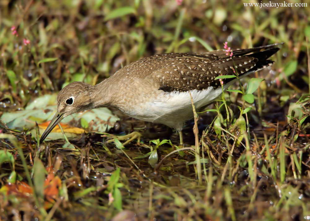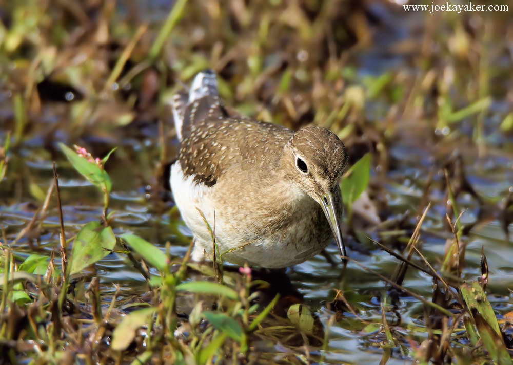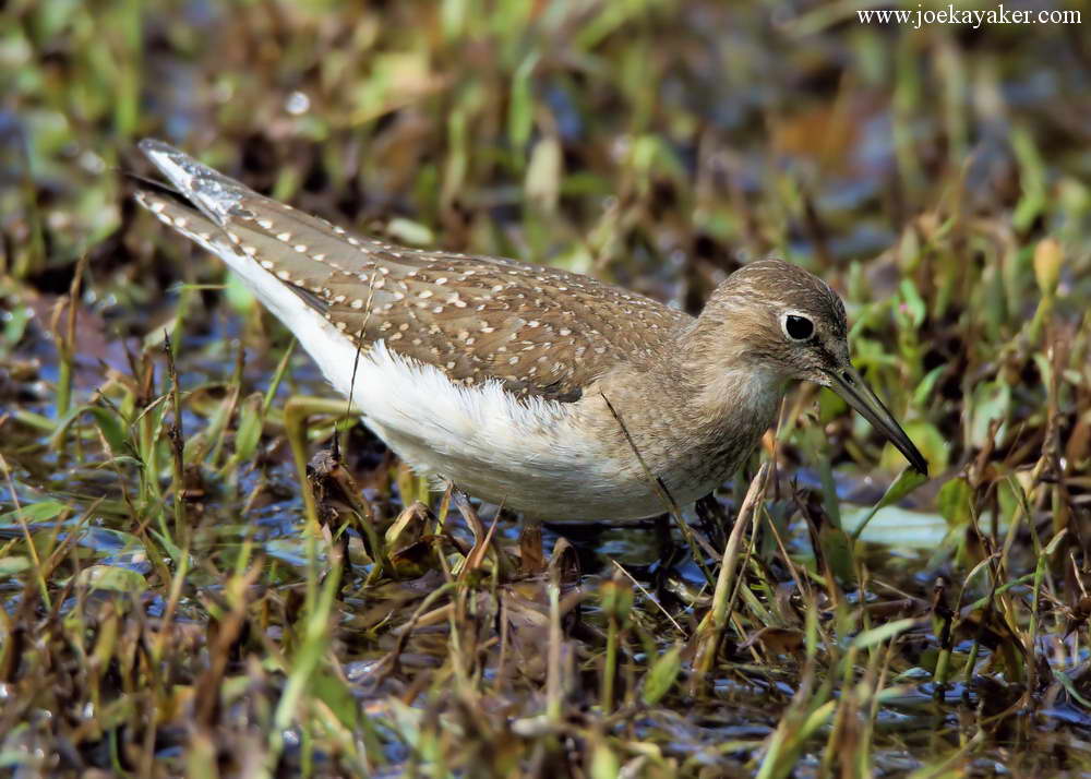 Of course, ducks are not the only birds attracted to new watery habitats. New habitats offer new opportunities. After some recent rains created this new wetlands at least one Solitary Sandpiper decided to take advantage of the new digs. Actually, three different Solitary Sandpipers found the puddle but on most days only one was present. I guess they really do prefer to remain solitary, although I did manage to see all three birds on one occasion. These shots were all taken on the same day and of the same bird as it was sampling the local fare. JK
