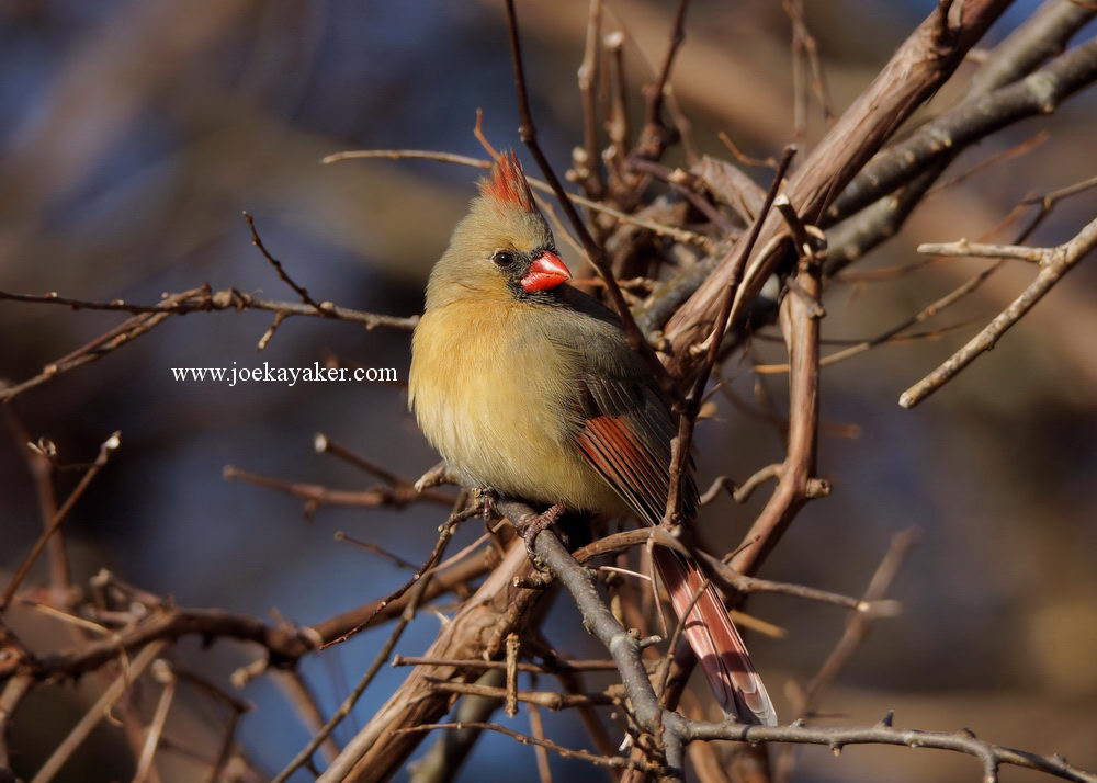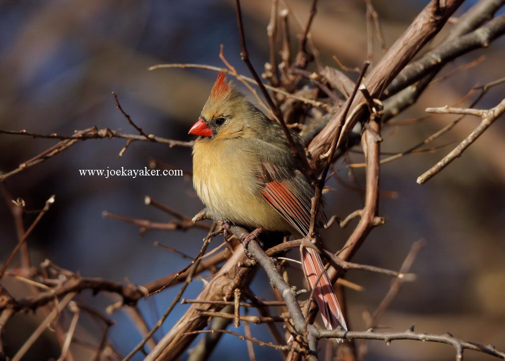 Their subdued coloration is probably a genetic-borne defense to help them stay unnoticed by predators while they raise their young. Mother Nature is very wise in Her ways. However, even with “drabber” colors, those ladies are still a wonder to behold. Female Cardinals are amongst the prettiest birds that we get to see here on Long Island, even with their muted coloration. Look at this bird. Do you really think that she is any less spectacular than her mate? JK