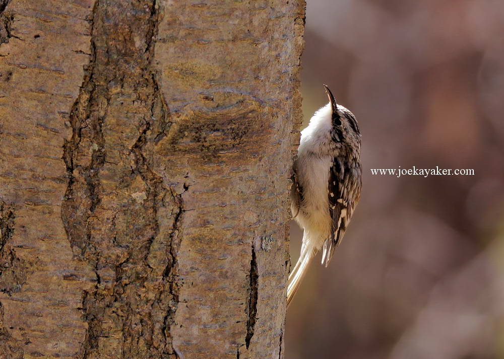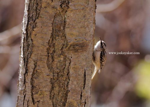 She also told me that “They can be a bit tricky to see as they creep around the trunks to the opposite side of the tree.” Ain’t that the truth. This bird was working tree trunks from the bottom up but he usually managed to stay on the far side of the tree without actually seeming aware of my presence. What I mean is, he appeared to be busy looking for insects rather than fleeing my camera. This photograph captures one of the few times I got to see the whole bird, rather than a partial glimpse. I definitely got lucky here. JK