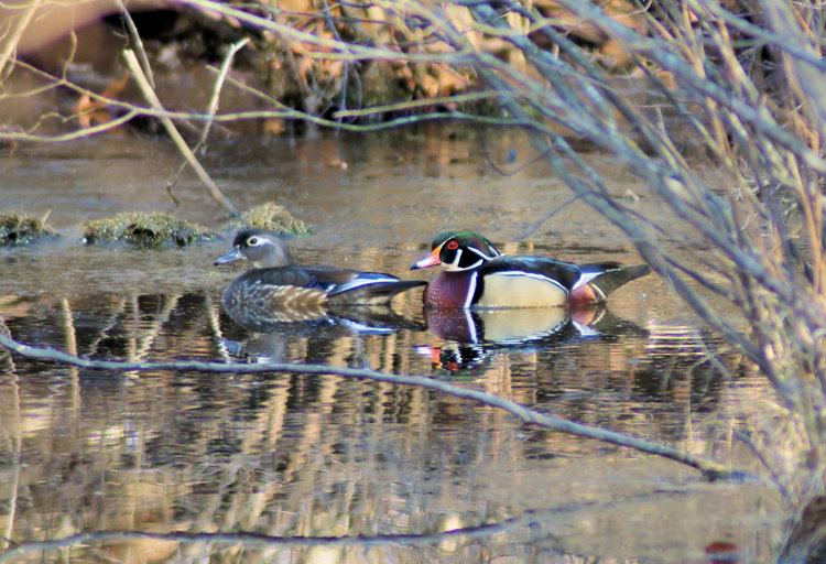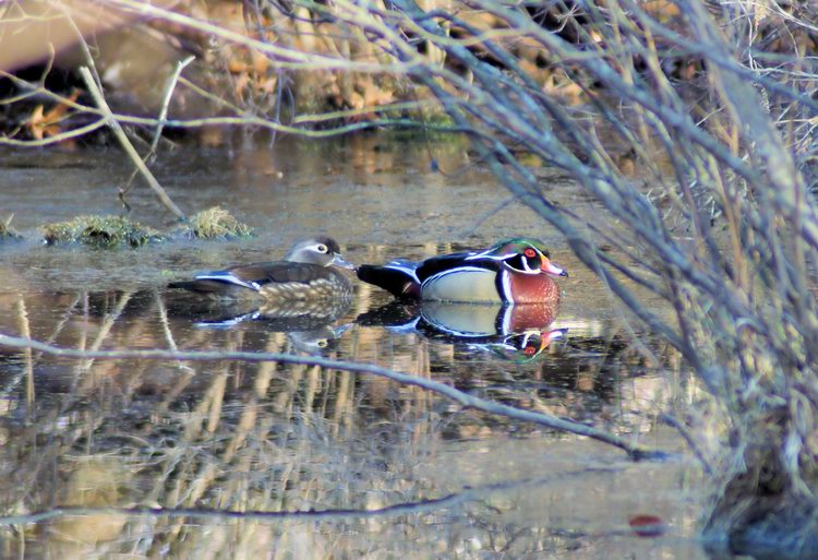 This is a pair of Wood Ducks on the freshwater pond at David Weld Sanctuary. The males are so extravagantly colored that sometimes I don’t even see the females with them. These shots should have been better, especially since I had to lay flat out on muddy ground to take them. But the photo gods do not reward effort alone. They seek focus. Focus of mind, focus of purpose, and focus in the freakin’ lens. What can I say? My dog ate my homework. JK