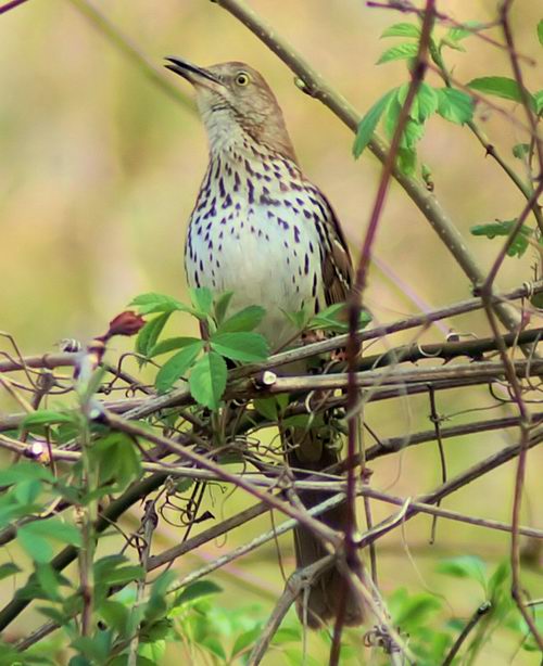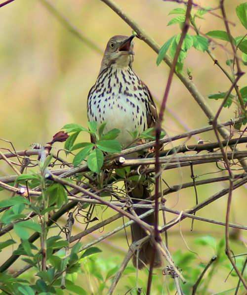When I got home and was reviewing the day’s catch I pulled out my Sibley’s and tried to identify this Robin-sized songster. My first guess was a Wood Thrush. But the eyes weren’t right. Wood Thrushes have all brown eyes and this guy has a dark pupil with a golden ring around it. Also, the Wood Thrush has a comparatively smaller tail than this bird. And this bird has a long thinnish bill that Wood Thrushes do not have. So it was back to turning pages. And lo, five pages later was my bird, a Brown Thrasher. Or at least I think it is. I can’t be sure because I am not a birder. But perhaps some of you are and can confirm or contest my guess. At any rate, here is another pic of this guy belting out a tune. Go baby go. JK