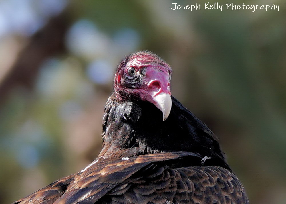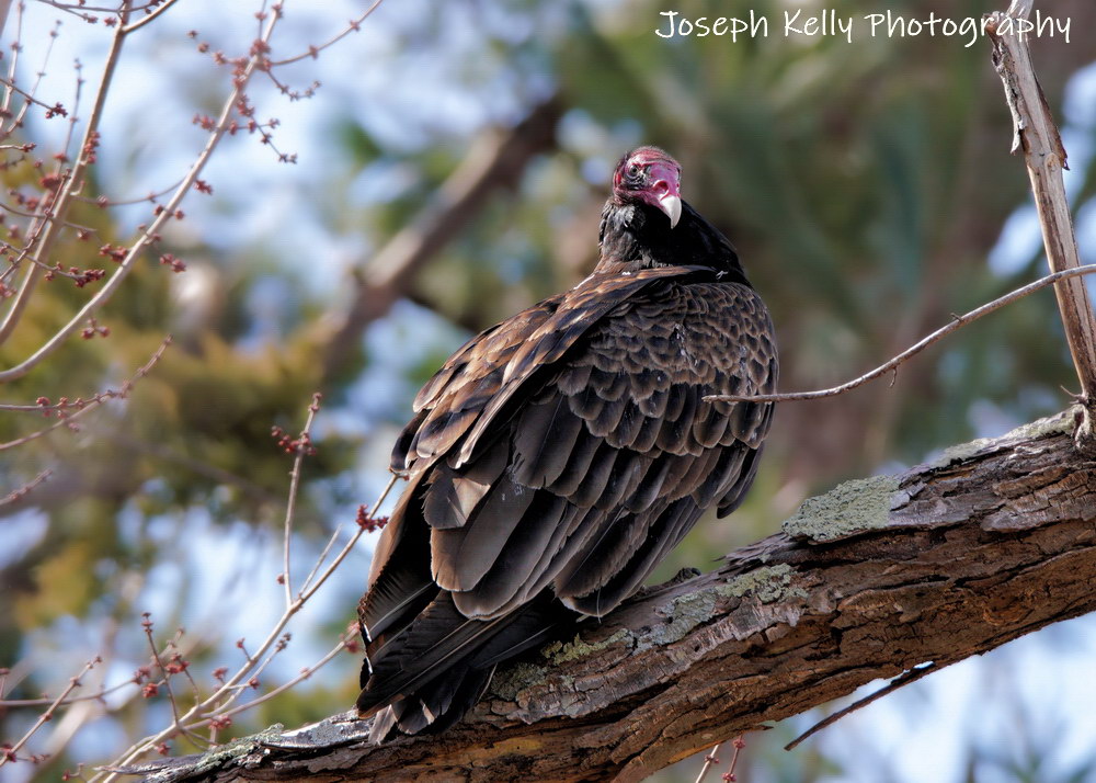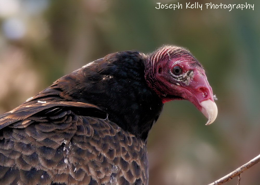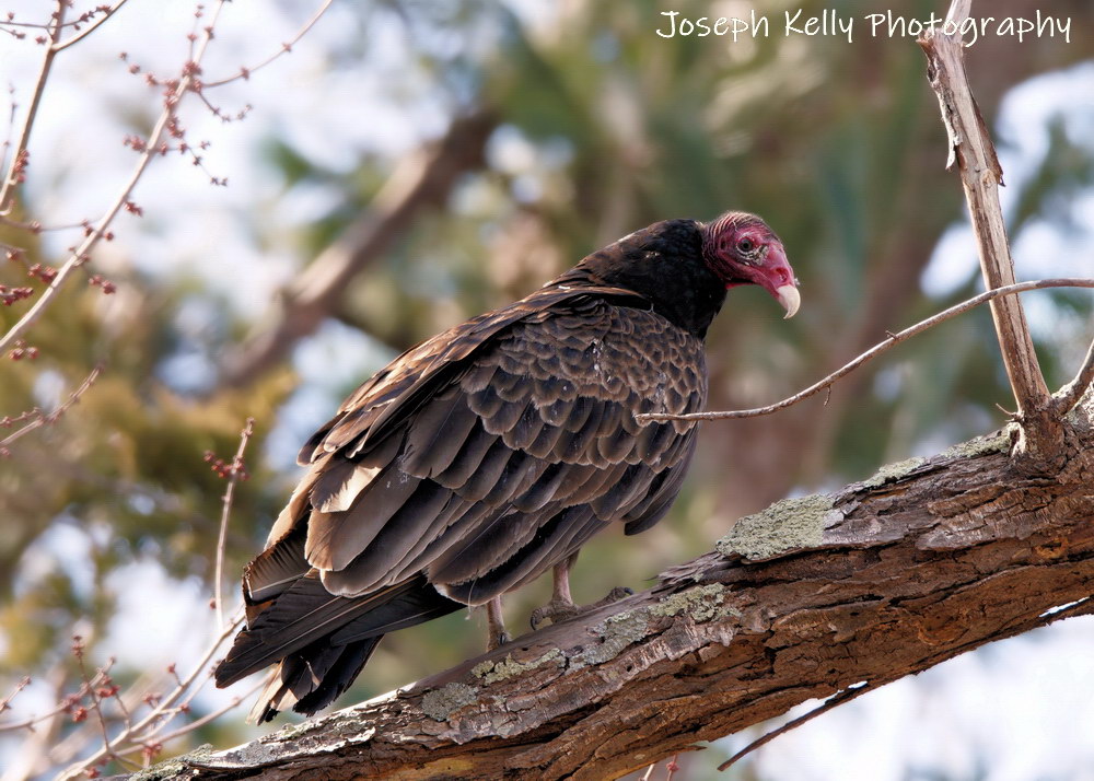 So anyways, some years, (but not every year), the female Turkey Vulture at Sweetbriar attracts roaming males. They will perch in the trees around her enclosure. Last Sunday, I had the opportunity to photograph a love-smitten male as he visited our grounds. It’s not every day that I get the chance to see a vulture that isn’t a half mile away so I pulled out my camera and took some photographs. Maybe I got something worth seeing. JK