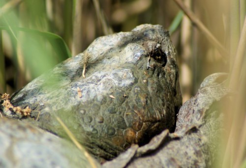 An eye very much like like this one saw dinosaurs. I went out for about four plus hours this morning. I found this Common Snapping Turtle just south of Terrapin Station. He and four others were pulled up along the bank. Everyone but this guy made for the river as soon as they saw me. At first this one was oblivious to my presence. He was out cold. I was even beginning to think he might be dead. And then, when he finally did raise his head to look me over, he didn’t care. I was three feet away and he just lay there eyeing me. I’m pretty sure that he is fairly old because of how smooth his shell was. Snappers are born with very keeled (jagged) shells that grow smoother as they age. Handsome brute, ain’t he? JK