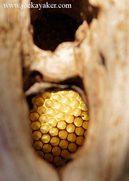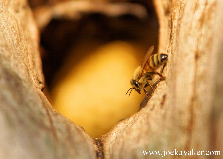 This is a shot of one of the honeybees at the edge of the hole in the tree that houses the honeycomb. That golden orb beyond this bee is the honeycomb, just out of focus. This thing is beautiful even when it’s blurry. It truly is a sight to see. Don’t miss it. JK.