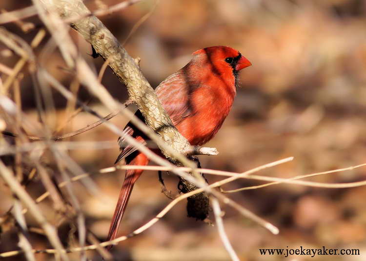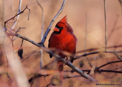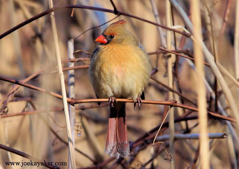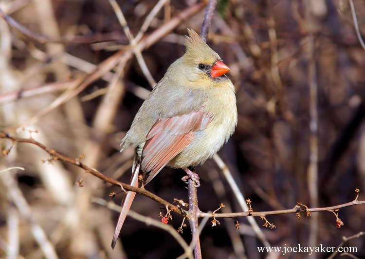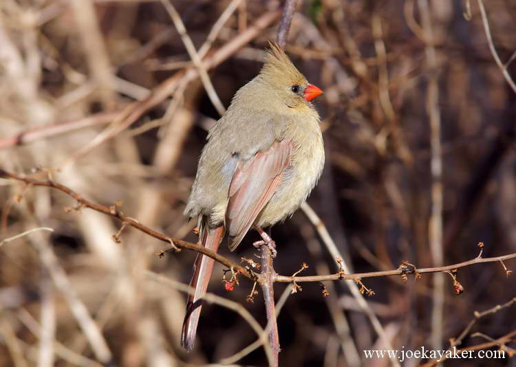 This is a female Northern Cardinal that I photographed last month. The females may not be as flashy as the males but I think they’re just as good-looking. Certainly, the male Cardinals think so. This female is posing in the classic three-quarter and profile poses. She obviously knows how to work around the camera. JK.