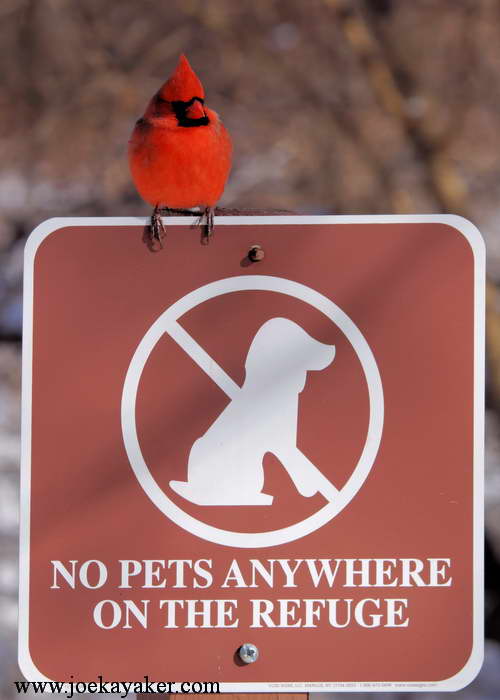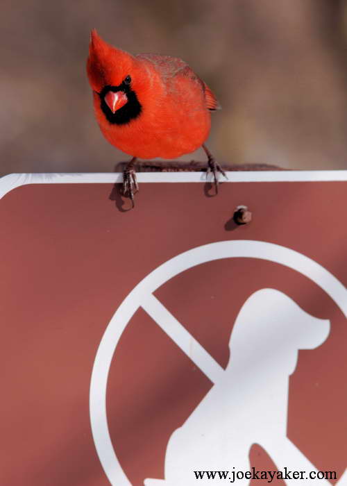 Unfortunately, there isn’t always a Ranger available to enforce this rule so, sometimes, a real nature lover needs to step up and see that this simple rule is obeyed. In this case, it’s Mr. Cardinal who has decided to work the entrance to see that even the simpleton bipeds take notice of the sign. It’s not an easy job but someone has to do it. JK