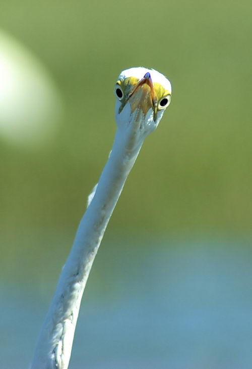 I came across this Great Egret preening its feathers upon a post on the Lower Carmans River. I took several shots as it was going about its business but it wasn’t until I was going through my shots a few days later that I saw what I had captured. I laughed right out loud when I saw it. The same bird, with head, is pictured below. JK