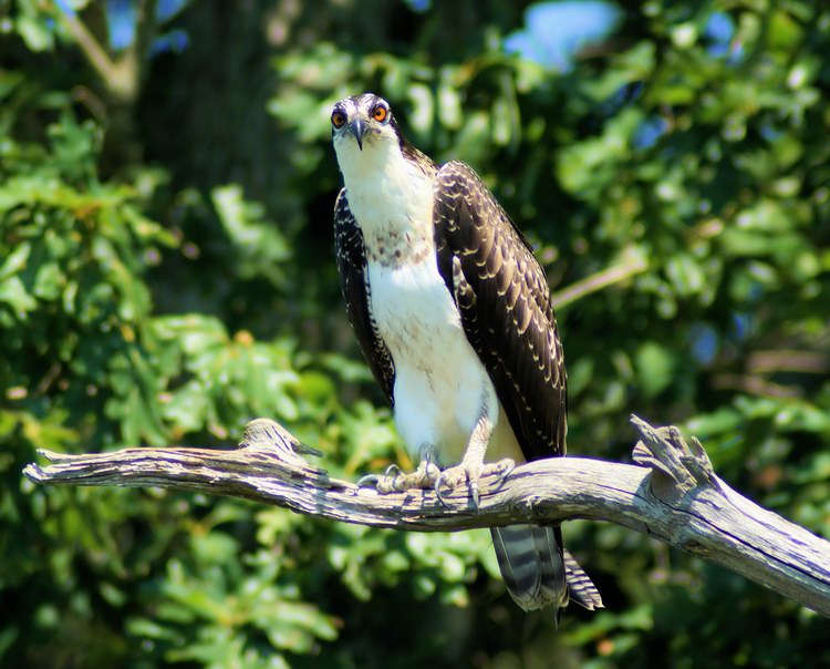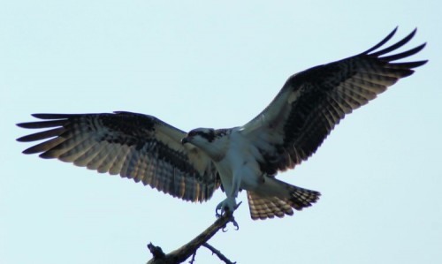 20130920081948 (5)-8x10wI had paddled this same area two weeks before. The only Ospreys still in the area were all juveniles, just like this one. All of the adults had already departed to Central and South America. The juveniles stick around to hone their fishing skills for about a month after their parents depart and then they follow them down to warmer climes. For the first hour of my trip I saw no Ospreys at all and I was thinking that I had missed the last of them when I found this guy perched above one of my favorite ‘holes’ on the Carmans. He gave me plenty of time to take my shots and then some, which I was very happy for, especially as he turned out to be the only Osprey left. One last photo shoot for his fans and then he’s off to work on his tan. Good luck, young one. I hope to see you again. JK