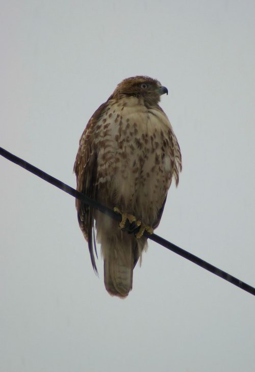 This juvenile Red-tailed Hawk was sitting on a telephone wire during the snowstorm we had three days ago. Red-tails don’t get red tails till they become adults. I’d like to thank my friends Eric from Your Connection To Nature, Janine from Sweetbriar, and Sue from Four Harbors Audubon Society for helping me identify this guy. That tail was throwing me. JK