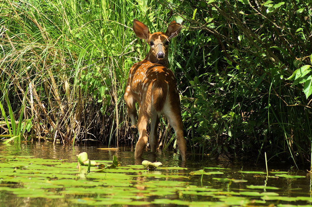 This pic was taken along the Northwest Bay Brook which feeds into Lake George. I was on the return leg of a foray into the lake when I came across this sight. And what a sight it was. I have to confess that you’re not being treated to the best shot I could have taken. That’s because I never took the best shot. When I came around the bend and saw this guy, he was facing me full on. For a full ten seconds I was in such awe of the image that it never even occurred to me to reach for my camera. Sometimes a moment can be so all-encompassing, even sublime, that I fail to react. Plus, I’m no spring chicken so maybe I don’t think as fast I should. Just telling it like it is. Anyways, when I finally picked up my camera this little one had already turned its back to me and was looking for an exit. Surprisingly, it did not seem at all frantic. Instead of just jumping onto dry land – and trust me, fawns can jump amazingly well – this young one was choosing its spot. It even took the time to have another look at me. That’s the shot you’re seeing here. Click on the pic to see a larger version. This is not the best photo I could have taken but it’s not all that bad just the same. I think it still conveys the magic of quiet waterways. JK