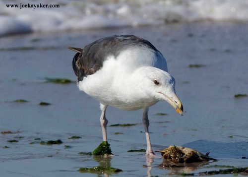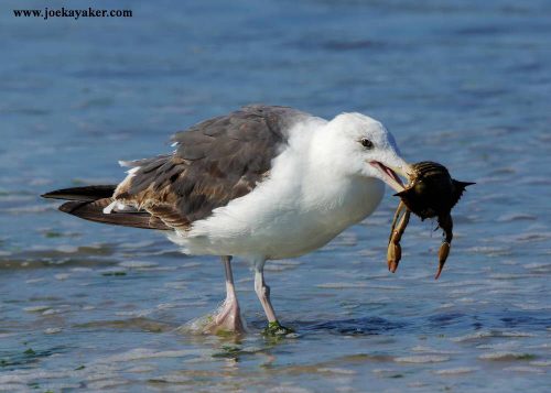 This is a pair of photos of a Great Black-backed Gull earning an honest living. All too often I see these and other gulls dumpster diving or stealing the catches of other birds. It’s nice to see one working for a change. Of course, this particular crab may not feel the same way. JK
