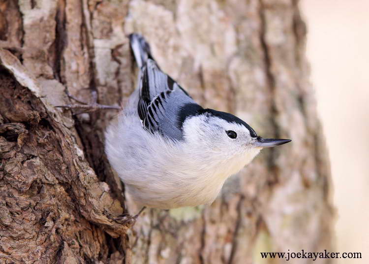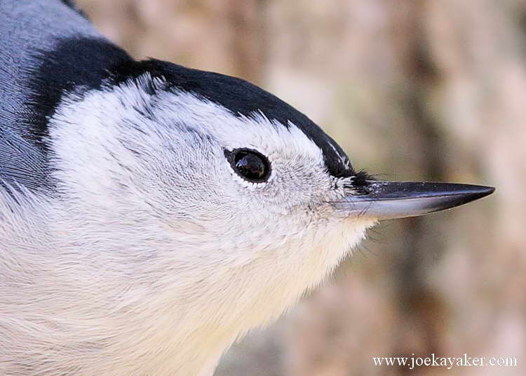 This is a White-breasted Nuthatch that I saw at Morton Wildlife Refuge in Noyack, NY, which is just out side Sag Harbor. I got pretty lucky with this shot because these birds don’t sit very still for long. They are very active among the tree limbs and trunks, looking for insects. I managed to capture this guy while he was checking me out. Below is a closeup of this little guy’s head. You can really see its feathers quite clearly. JK