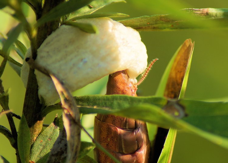 Here are a couple of shots of a female, (obviously), Praying Mantis laying eggs on a Goldenrod stem. This was not an obvious fact when I first came across this scene. I was walking through the farm fields at Avalon – has anyone noticed how many of my recent posts come from Avalon? – when something, maybe it was movement, I really don’t know, caught my eye. When I first saw it, I knew I was seeing something cool. (Yes, I am a product of my generation.) Some sort of large segmented worm that was seated in a leaf bud was making a cocoon for itself.