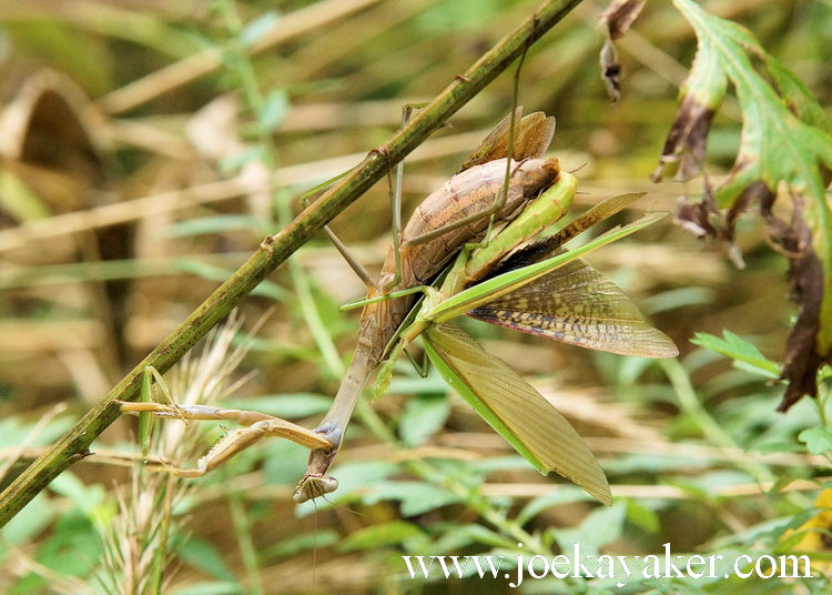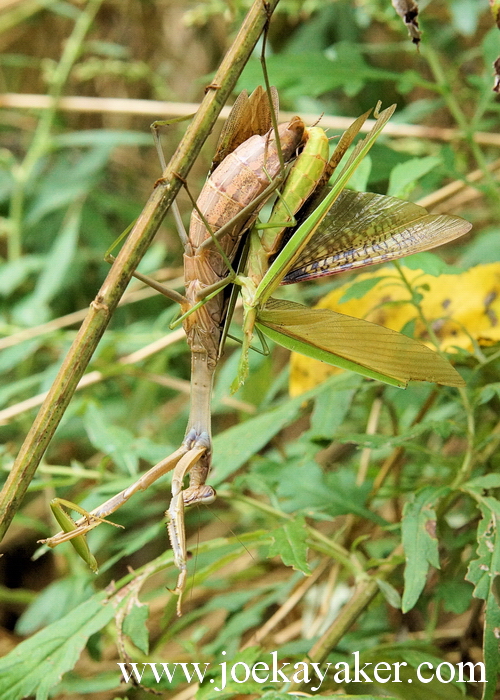 At this point I should maybe explain that Joe Kayaker is in need of bifocals that he does not yet wear. There could be some vanity at work here but let’s get back to the story at hand. Anyways, I took off my glasses and leaned in close for a better look. So cool, really. I really love nature at work. But at this point, I’m still seeing what I think is some weird caterpillar or segmented worm, although I don’t know of any worms that make cocoons. So I re-goggle myself (I can see, I can see!) and switch cameras for a wider angle (less close-up) and there is a mantis laying eggs. What I thought was a weird sort of worm was, instead, a pregnant abdomen and the leaf bud turned out to be the wings of an upside down Praying Mantis. I laughed right out loud. A real “duh!” moment for me but, hey, still very cool nonetheless.